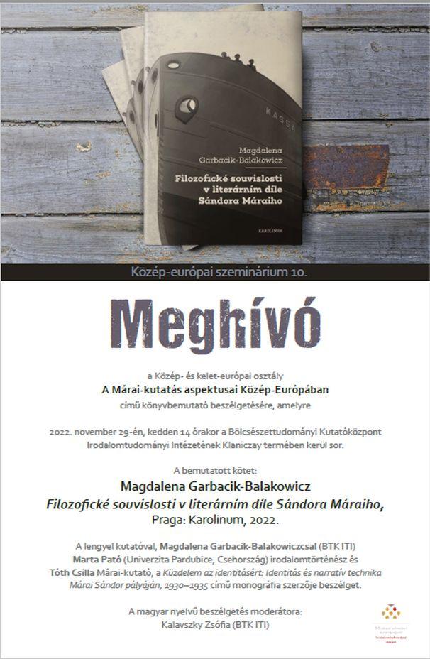 A prágai Academia Kiadó az ősz folyamán jelentette meg Magdalena Garbacik-Balakowicz: Filozofické souvislosti v literárním díle Sándora Máraiho című kötetét, amit a múlt héten mutattak be Budapesten a Bölcsészettudományi Kutatóközpont Irodalomtudományi Intézetében. Az eseményt Kalavszky Zsófia moderálta, a beszélgetésen részt vett Marta Pató és Tóth Csilla.
