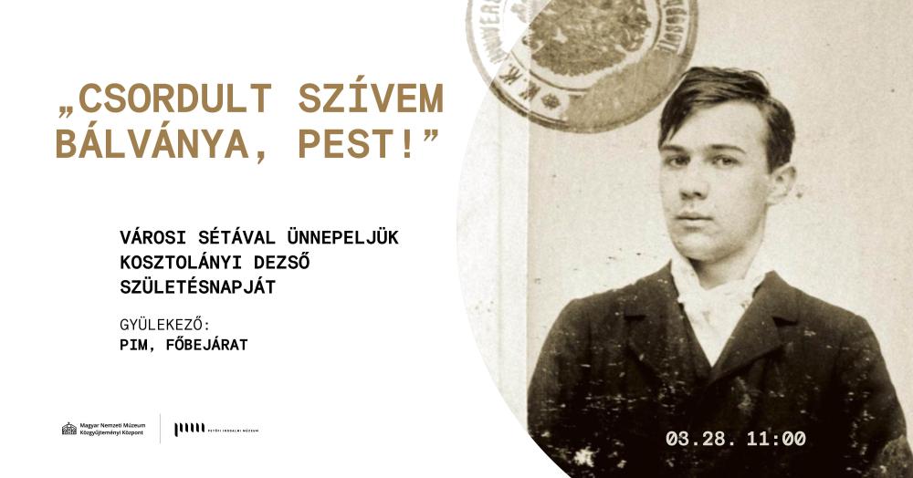 A séta során bejárjuk azt a városrészt, ahol a fiatal Kosztolányi megérezte az Üllői úti fák édes illatát, megnézzük hol állt egykori törzshelye, a Báthory kávéház, s megidézzük a füstös, gőzös kávéházi alkonyból felbukkanó Esti Kornél legendás alakját.