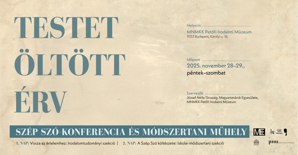 Testet öltött érv címmel rendez Szép Szókonferenciát és módszertani műhelyt a József Attila Társaság, a Magyartanárok Egyesülete és az MNMKK Petőfi Irodalmi Múzeum. A kétnapos rendezvénynek a Petőfi Irodalmi Múzeum (1053 Budapest, Károlyi u. 16.) ad otthont 2025. november 28-án és 29-én. A részvétel ingyenes, de előzetes regisztrációhoz van kötve.