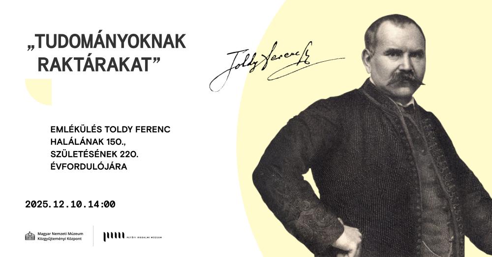 Az MNMKK Petőfi Irodalmi Múzeum emlékülést rendez Toldy Ferenc halálának 150., születésének 220. évfordulójára, melynek előadásai az életmű művelődéstörténeti aspektusát villantják fel, s a közismert irodalomtudós portréja mellett a könyvtár- és gyűjteményépítő, kéziratgyűjtő kutatót állítják fókuszba, nem megfeledkezve Toldy Ferenc orvosi pályájáról sem.