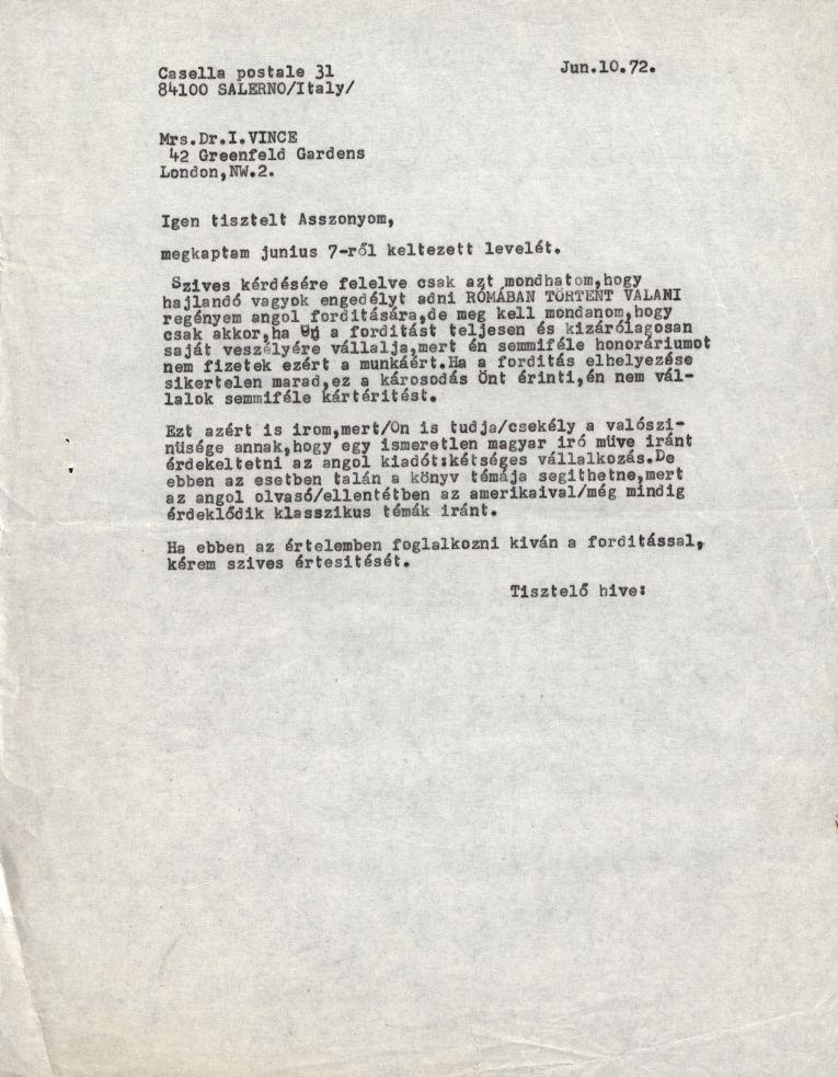 Márai az emigrációban sokat küszködött azzal a problémával, hogy művei nem láttak napvilágot más nyelveken. Miközben sorra jelentek meg regényei németül, olaszul, frissen írt alkotásainak alig vagy nem volt esélye erre, különösen nem angol nyelvre. Ezért is ritka az olyan megkeresés, mint a most bemutatott: a levél szerzője, a londoni Vincze Istvánné felajánlotta a Rómában történt valami idegen nyelvre ültetését. Ez elől Márai nem zárkózott el, de figyelmeztette az "alkalmi fordítót", hogy ezt minden kötelezettség nélkül kell tennie - ő sem honoráriumot, sem kiadót nem tud biztosítani.