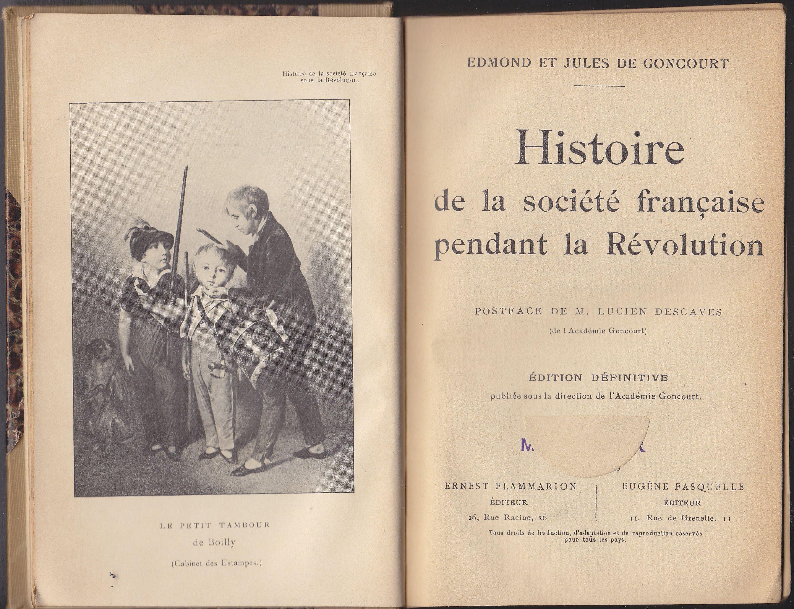 Angol lordok szoktak így tanulmányt kezdeni: „Az az ősnyomtatvány, amire nemrég a kastélyom könyvtárában rábukkantam...” Valahogy így kezdhetném én is, talán csak azzal a megszorítással, hogy mindig is tudtam, a könyv, amiről beszélni fogok, megvan valahol. Pár napja újra kezembe került. Emlékszem, még diákkoromban, 1965-ben vagy 1966-ban vásároltam a legendás Váci utcai antikváriumban, potom tizenöt forintért (ez ceruzával oda is van írva a hátsó védőlapra). Az eredetileg papírfedelű kétkötetes könyvet valamikor gondosan bekötötték. Hogy a csinos félvászon kötés hazai mester munkája-e, vagy franciáé, nem tudom megállapítani. Edmond és Jules de Goncourt Histoire de la société française pendant la Révolution et pendant le Directoire [A francia társadalom története a forradalom és a direktórium alatt] című művéről van szó; a két könyvet először 1854-ben és 1855-ben adták közre, de a tulajdonomban levő egybekötött két kötet – a Goncourt Akadémia főtitkára, Lucien Descaves utószavával – 1928-ban, illetve 1929-ben jelent meg.
