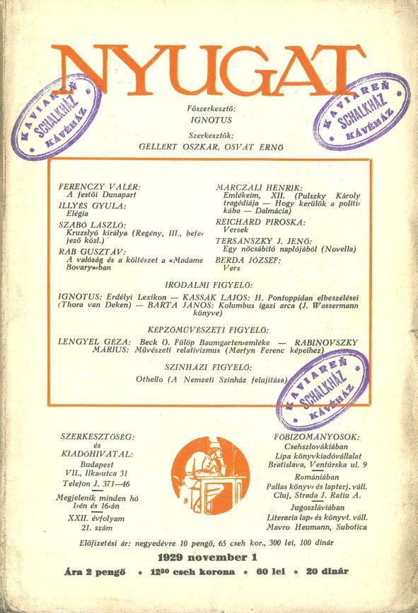 Az itt látható Nyugat példányon jól látszik a szálló kávéházának kétnyelvű pecsétje (még a lapszámon belül is három helyen lepecsételték!). E különlegességgel emlékezünk az íróra: február 21-én volt 33 éve, hogy elhunyt.