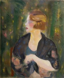 Márffy Ödön az 1900-as évektől baráti kapcsolatban állt Ady Endrével. Az ő révén ismerkedett meg Csinszkával, akit a költő halála utáni évben, 1920-ban feleségül vett. Csinszka múzsája volt második férjének is, aki száznál is több alkalommal rajzolta illetve festette le őt. A mintás vállkendős portré a festő 1920-as évektől jellemző könnyedebb, dekoratív stílusának jellegzetes alkotása.