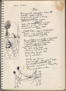 Kép Gyűjtemény Kéziratgyűjtemény 1960-as évek Kéziratlap Nagy László versíró-füzetében saját tintarajzaival. A költő műfordításai 2000-ben, szórványként kerültek gyűjteményünkbe. Előző műtárgy Következő műtárgy