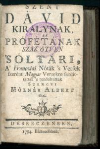 Szenczi Molnár Albert zsoltároskönyve először 1607-ban jelent meg. A képen az 1784-es kiadás címlapja látható. A Psalterium Szenczi Molnár életében háromszor, a 18. században mintegy harmincszor, háromszáz év alatt több mint százszor jelent meg. A református énekeskönyv ma is az általa fordított százötven zsoltárral kezdődik.