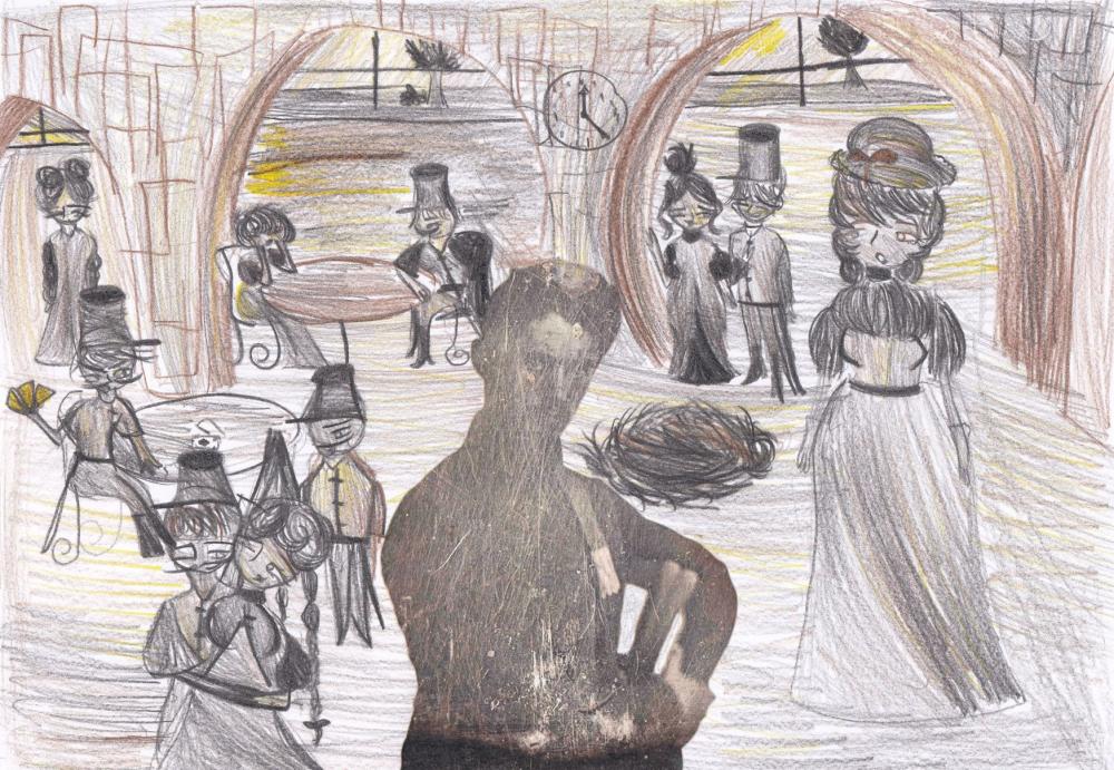 A kép címe: Elmosódott emlékek Miközben a rajzomat készítettem, arra gondoltam, hogy naponta mennyi ember mellett haladunk el az utcán, azonban nem látjuk őket igazán.
