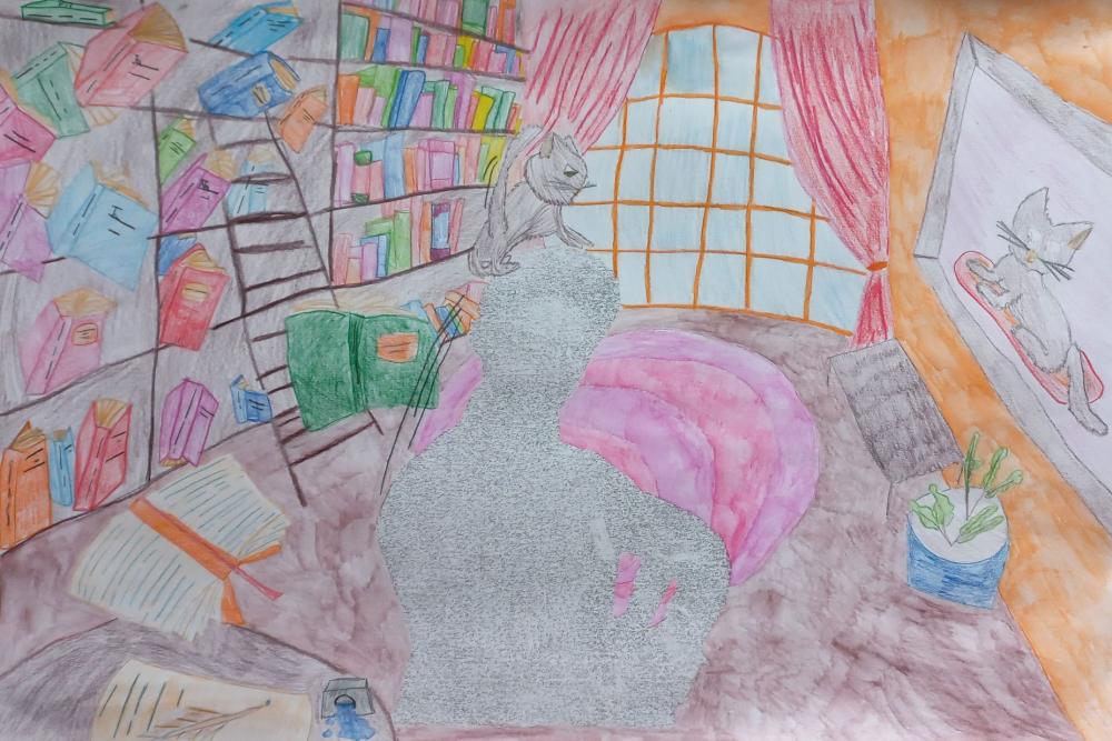 Csontos Rebeka Nikolett rajza színes, élénk, vidám, mozgalmas. Egészen egyedi technikai megoldásokat választott, a háttér sablonformái elé fekete és színes tollal, festékkel minden olyan zavaró körülményt megrajzolt, ami egy pillanat alatt megtörténhet, s akár tönkreteheti a készülő fényképet: „két labda berepült az ablakon. Megijesztette a szekrényen heverő cicát, valamint egy köcsög is leesik a helyéről és a következő pillanatban nagyot csattan a földön.” A jelenet látszólag kaotikus, de összetartják a jól megválasztott színek, s az arányos szerkesztés.