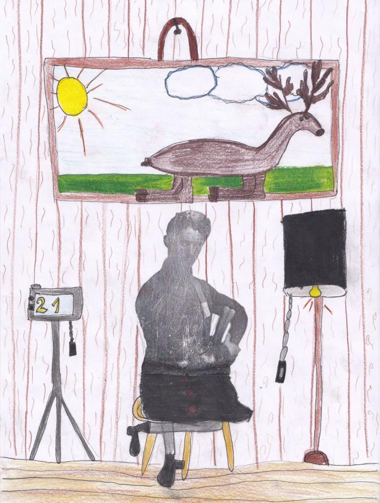 A Makói Általános Iskola és Alapfokú Művészeti Iskola 3–4. osztályosainak hatalmas újítása, hogy Petőfit „talpra” állították, lába nőtt, s így nem egy elvont szimbólumként van jelen, hanem részese a gyerekek által megrajzolt mindennapoknak. Varga Lara rajzán egy szoba, műteremsarok közepén lazán, átvetett lábbal ülő költőt látunk, körülötte a műterem fontos kellékei: egy gép háromlábú állványon, a képkészítéshez szükséges fényt adó lámpa és a háttérben egy izgalmas tájkép szarvassal. A tapéta függőlegesei és a padló vízszintes tagozása, a szimmetrikus kompozíció azt sugallja: Petőfi minden előkészületet megtett és feszülten várja, hogy a kép elkészüljön róla.